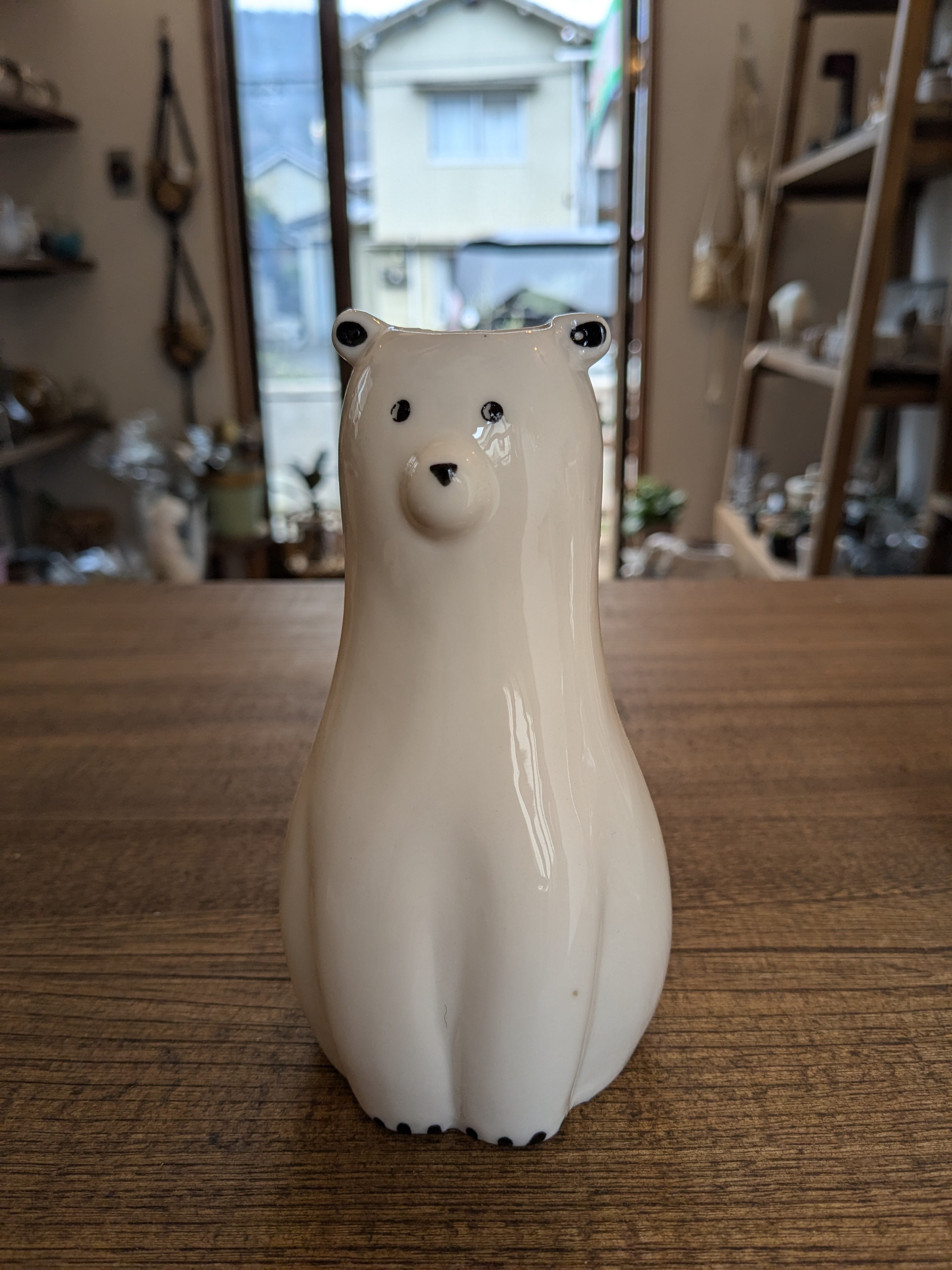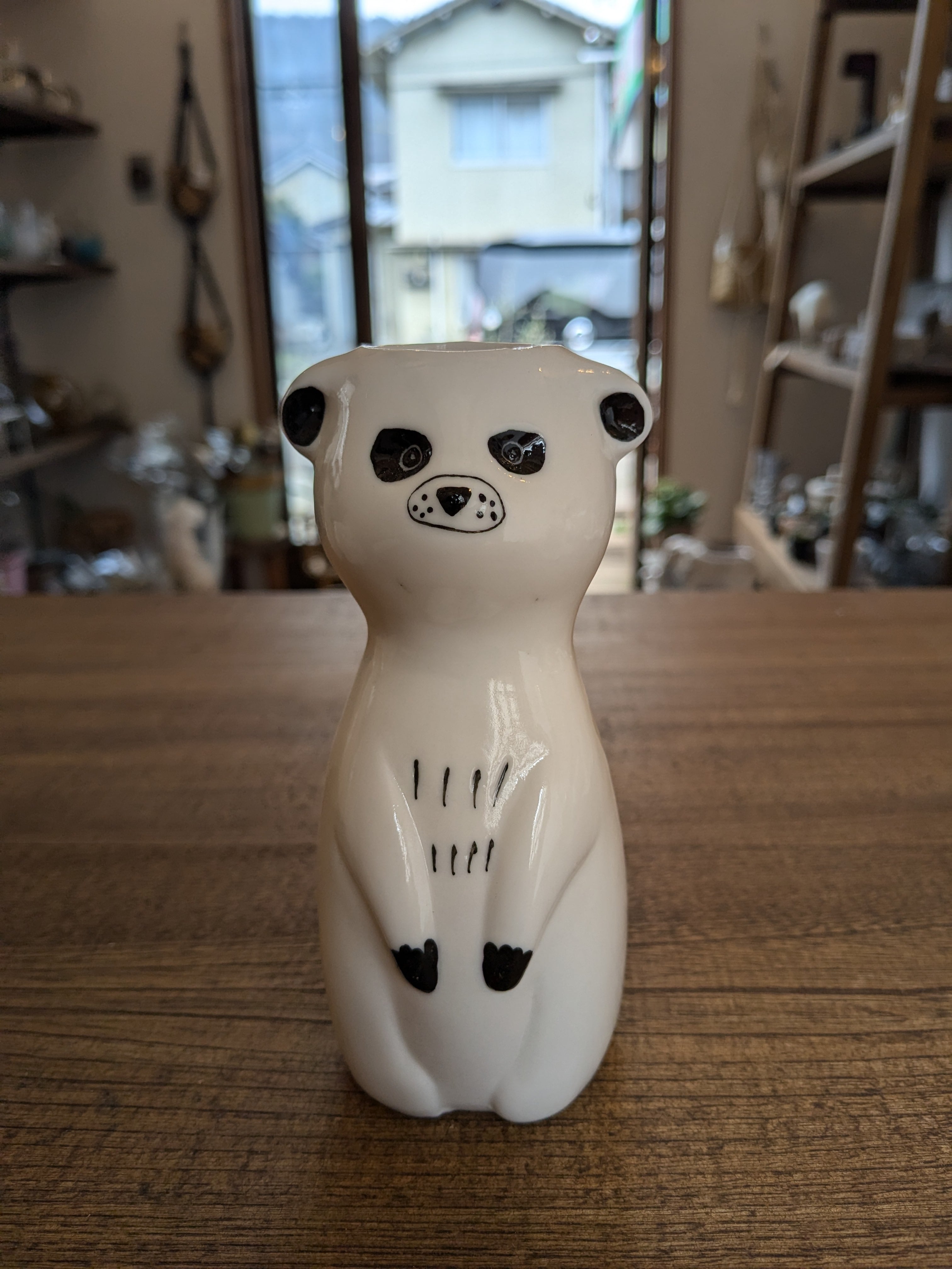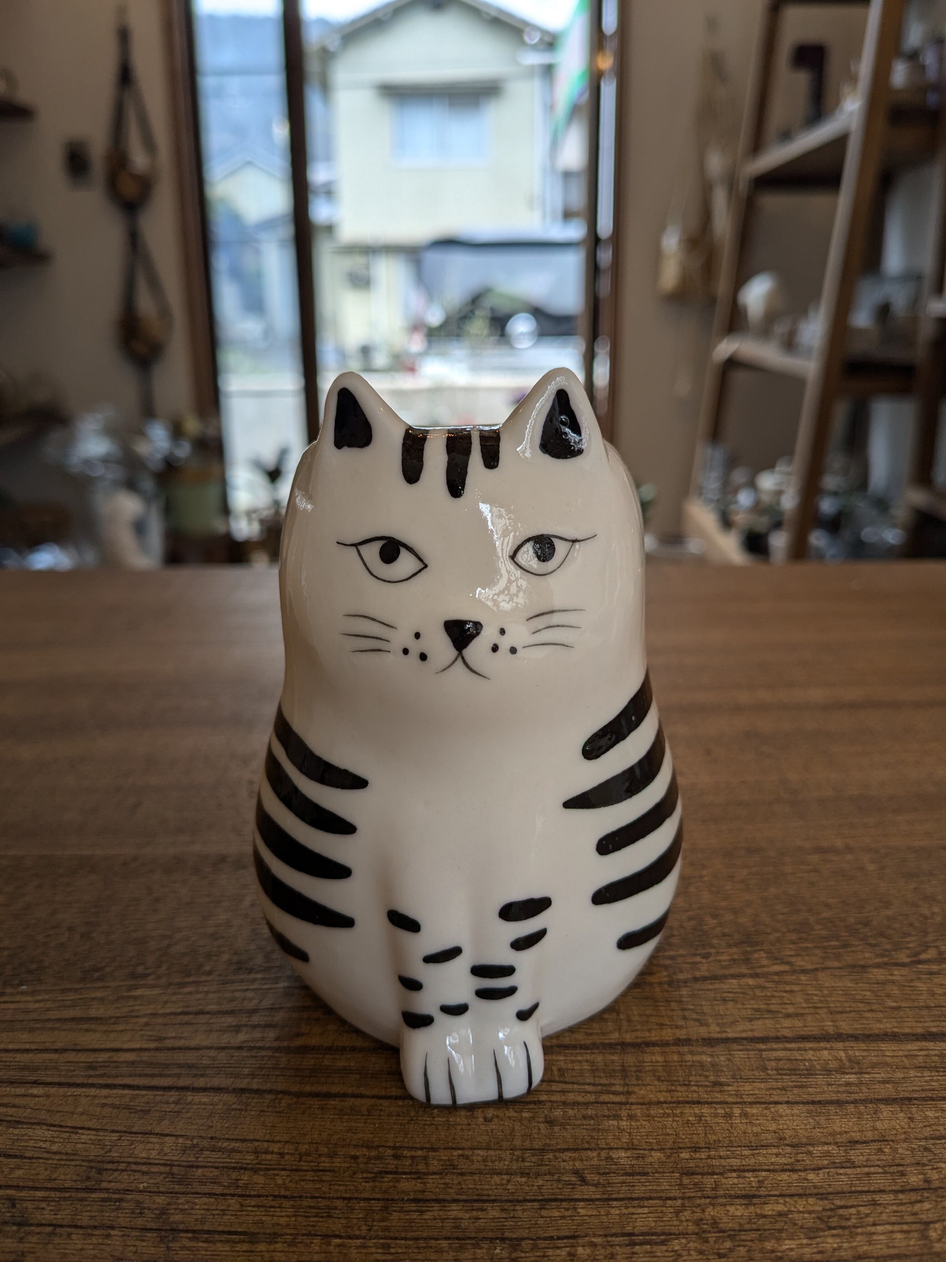 白い磁器で出来たぽってりとした丸い体に、黒の釉薬を使いハンドメイドで動物の表情を仕上げました。