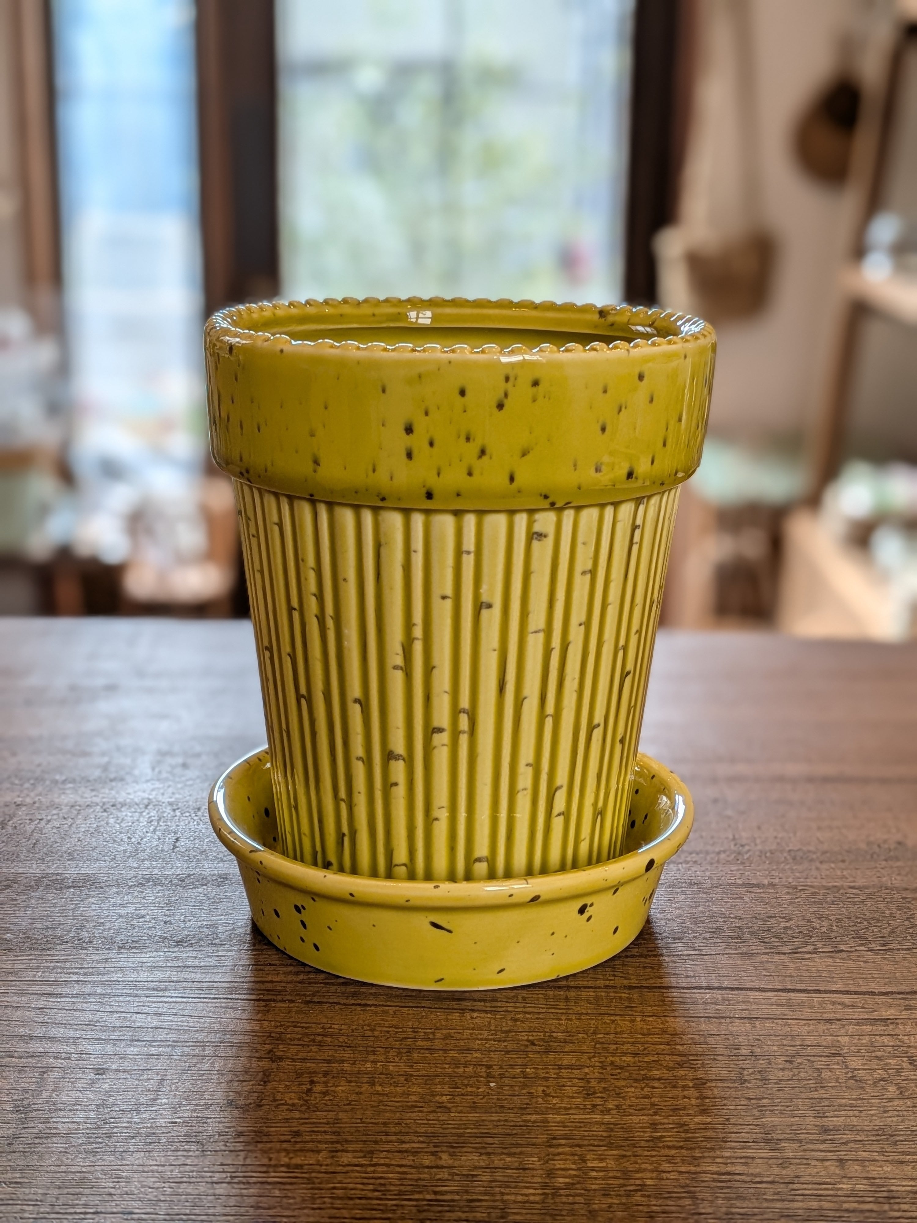 使いやすいベーシックな形の植木鉢。グリーンとイエローの2色展開。インテリアに馴染む派手すぎない色味が特徴。屋内でも汚れる心配のない受け皿付き。屋外使用でも色あせしにくい陶器製です。