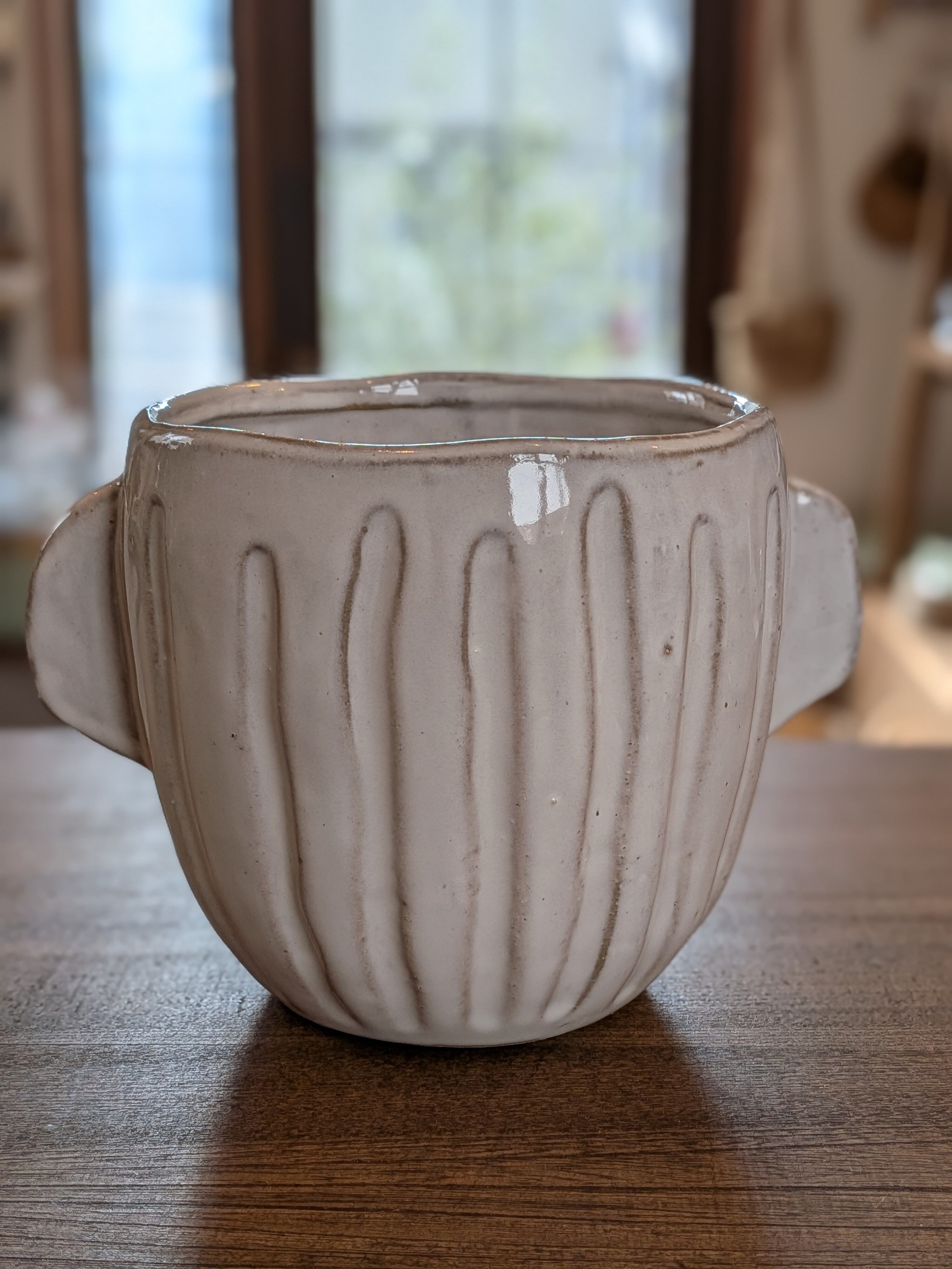 どんな植物とも合わせやすく、空間をやわらかく演出できる丸みを帯びたフォルムが特徴の植木鉢。手のひらサイズの小さい植木鉢なので、小物の多肉植物などにぴったり。クラフト感のある縦に入った彫り模様がナチュラルな風合いを引き立て、温かみを感じさせます。広めの開口部で植物の植え替えがしやすそう。屋外使用でも色あせしにくい陶器製です。