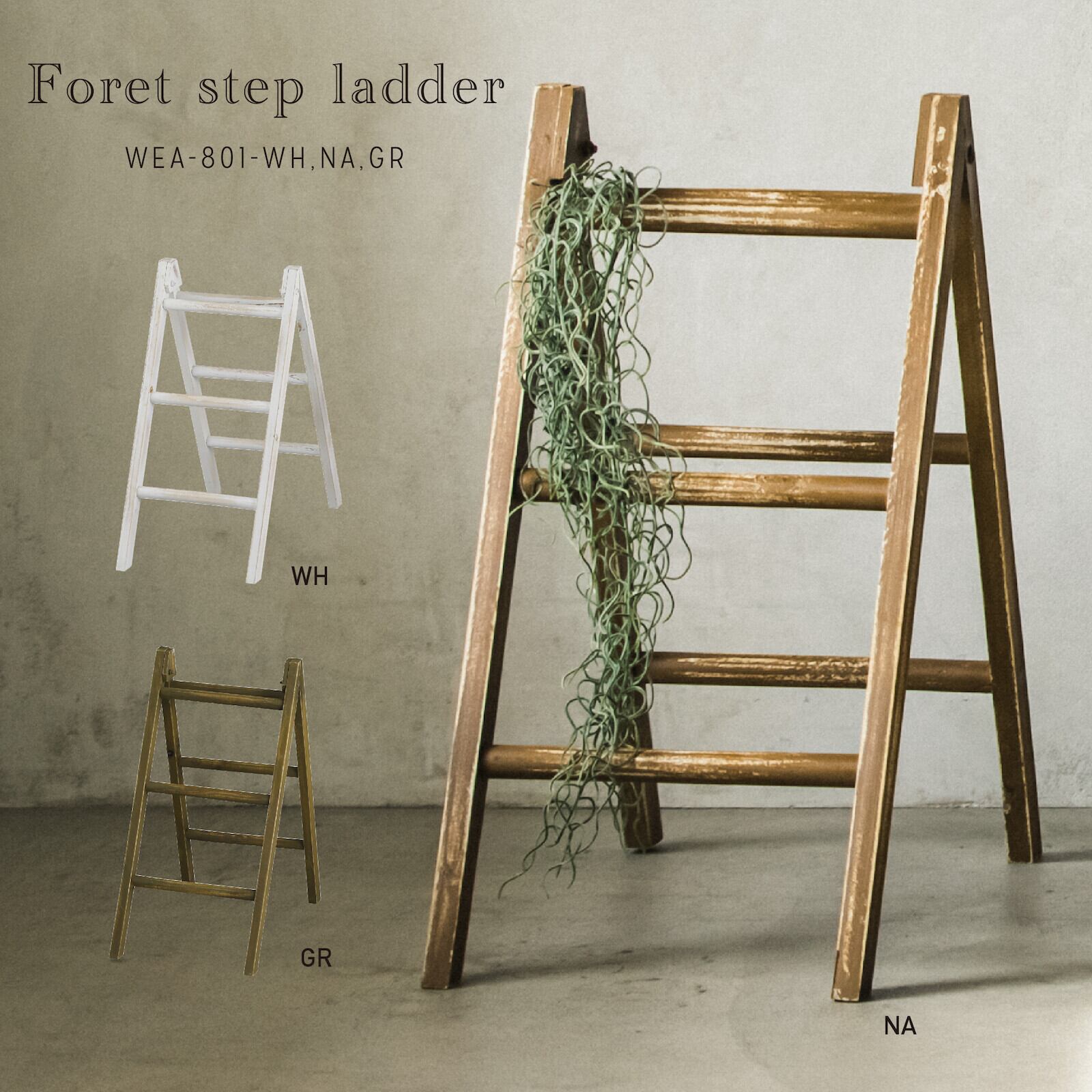 ナチュラルな素材感が魅力的な木製のインテリアアイテム。 どこか懐かしさを感じる木製はしご。木の温かみを感じれます。 フックポットなどをかけたり、楽しめるアイテムです♪ ★3色展開のカラー★