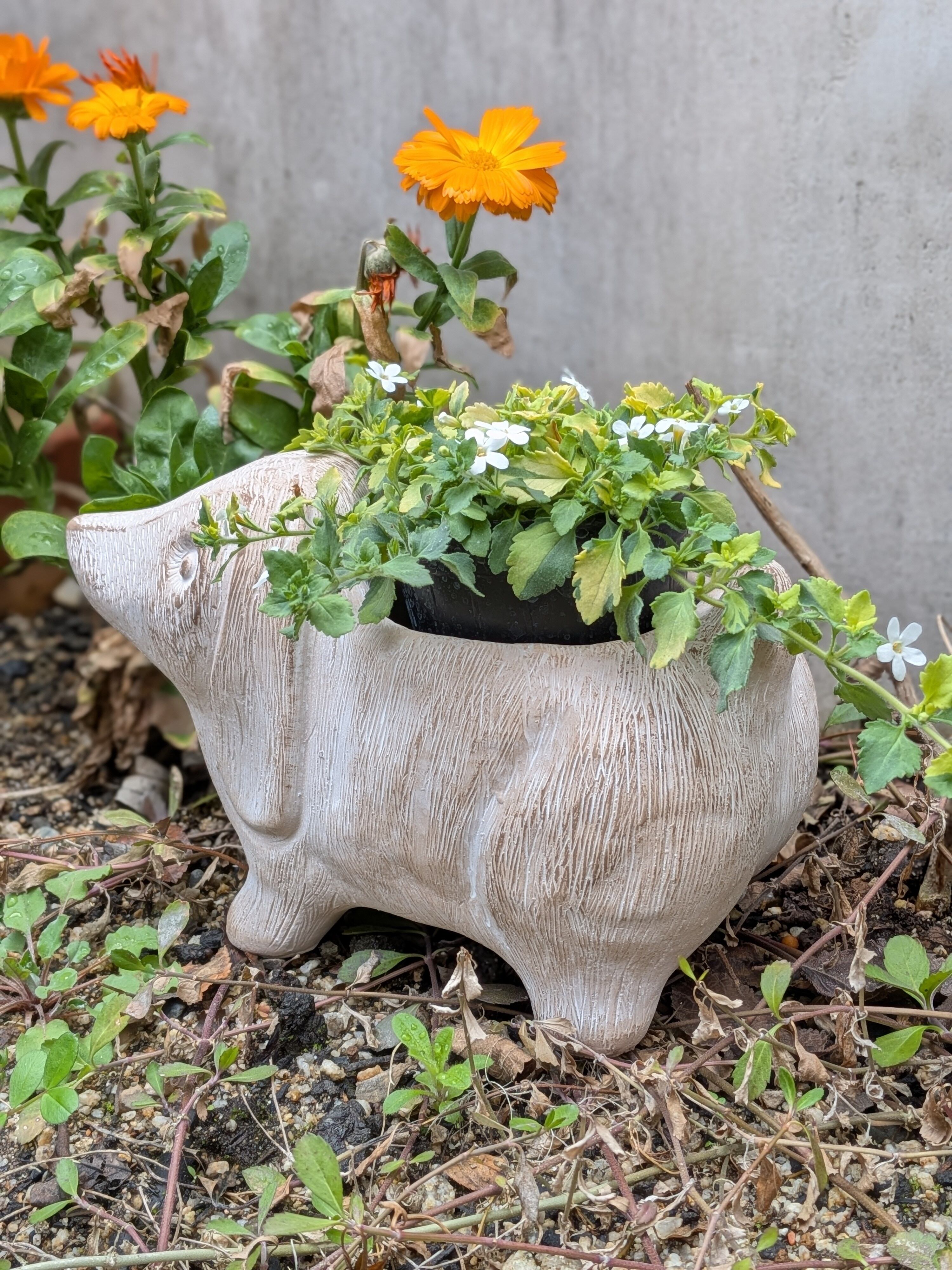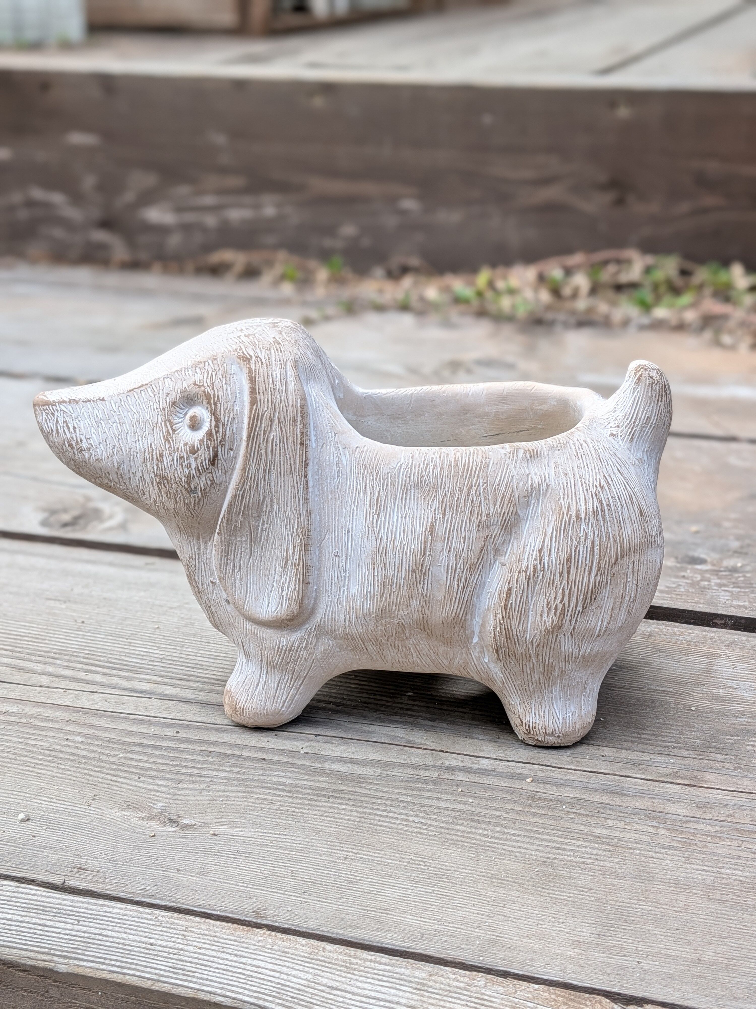 ブレーメンポットドッグは、セメント素材で作られたかわいい犬のデザイン鉢です。サイズW215×D110×H130のフォルムは、内径W80×D65の快適なスペースを確保し、多肉植物や小さな花を飾るのにぴったりです。独自の犬の形が、どんなインテリアにも溶け込み、楽しくてユニークな雰囲気を創出します。耐久性にも優れており、屋内外問わずお使いいただけます。