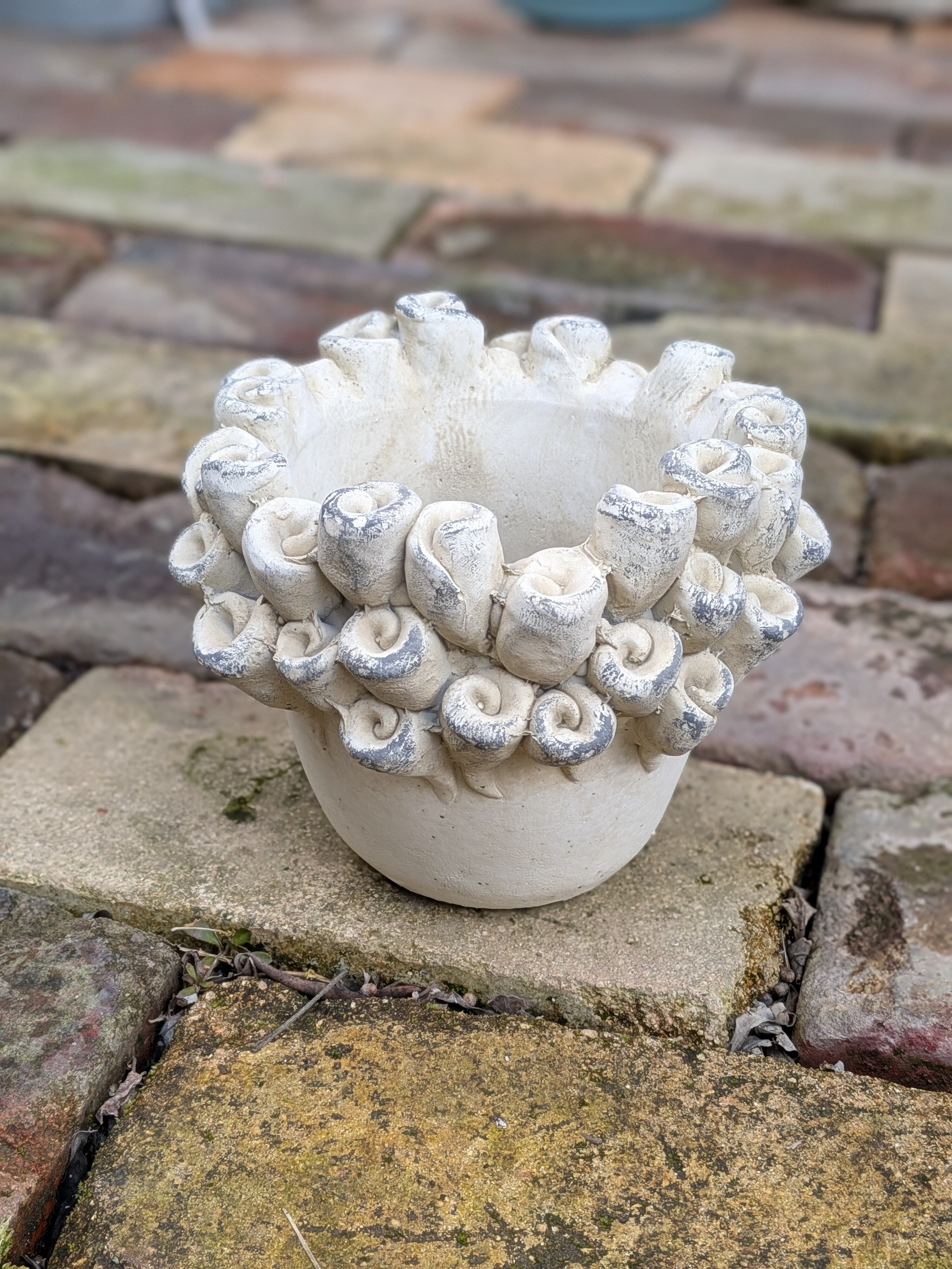 ブレーメンポットアクティニLは、セメント素材で作られた愛らしいふじつぼ型の鉢です。サイズW165×D165×H130のフォルムは、内径φ100のスペースを確保し、多肉植物や小さなお花を飾るのに最適です。この魅力的なデザインが、どんなインテリアにもマッチし、楽しくておしゃれな雰囲気を生み出します。優れた耐久性を持ち、屋内外問わずご使用いただけます。